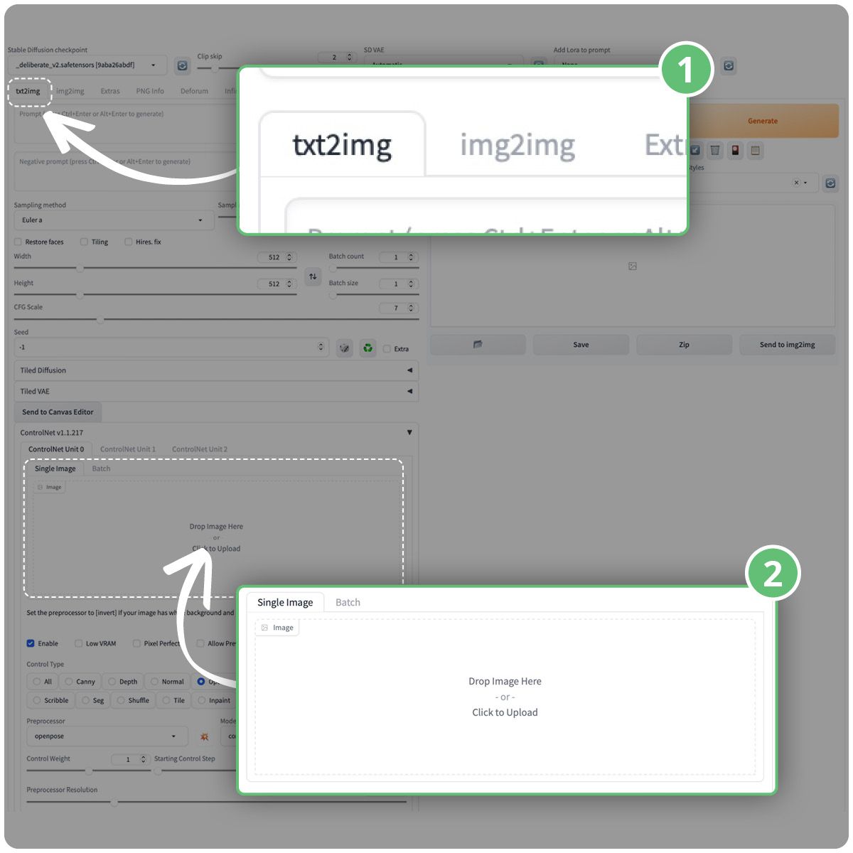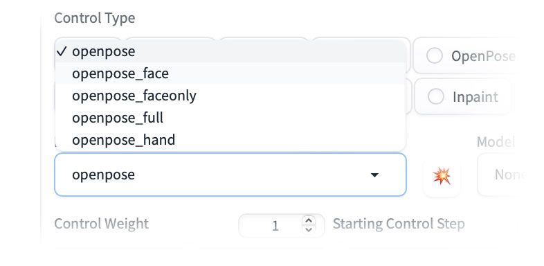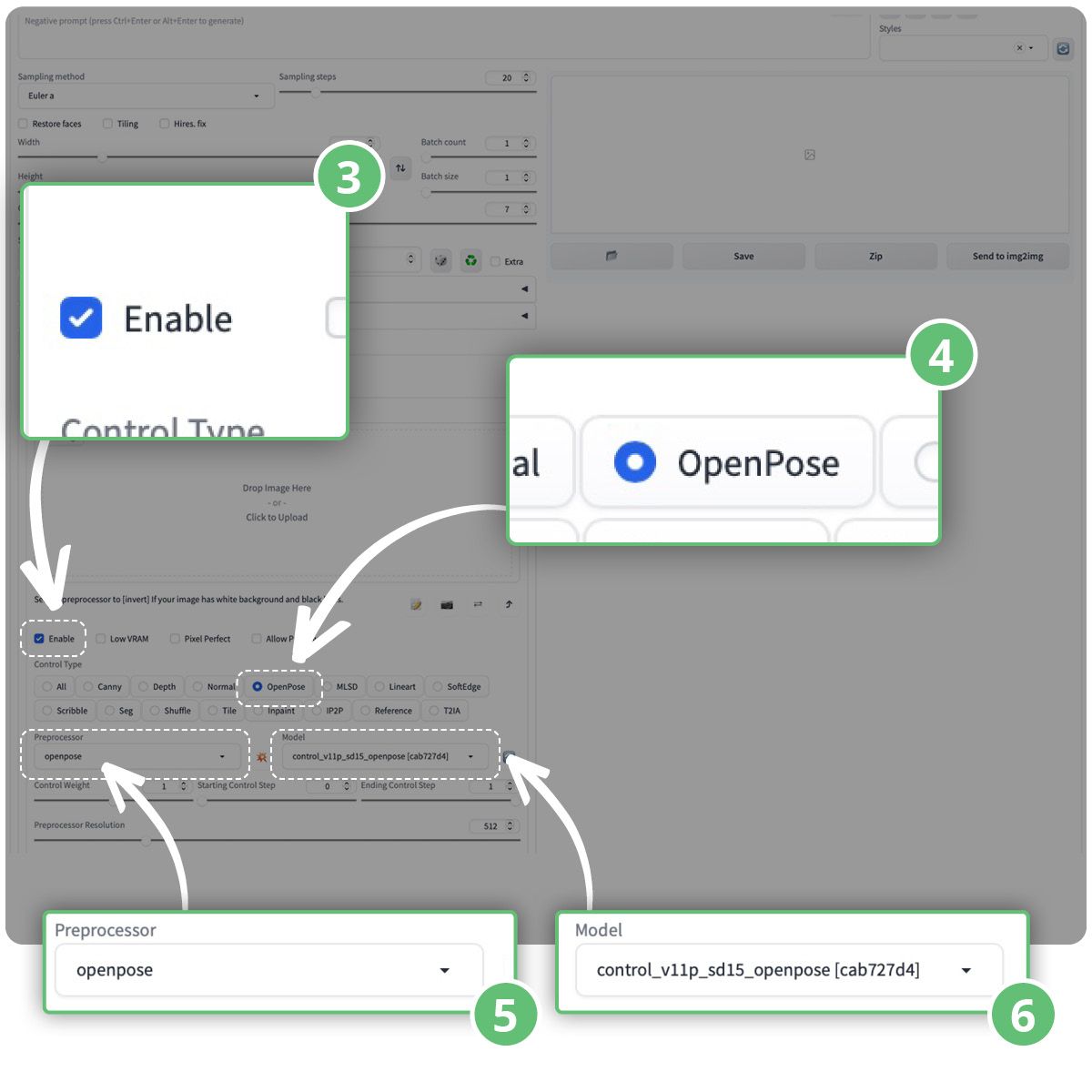 - (5) Select "openpose" as the Pre-processor. OpenPose detects human key points like the positions of the head, arms, etc.