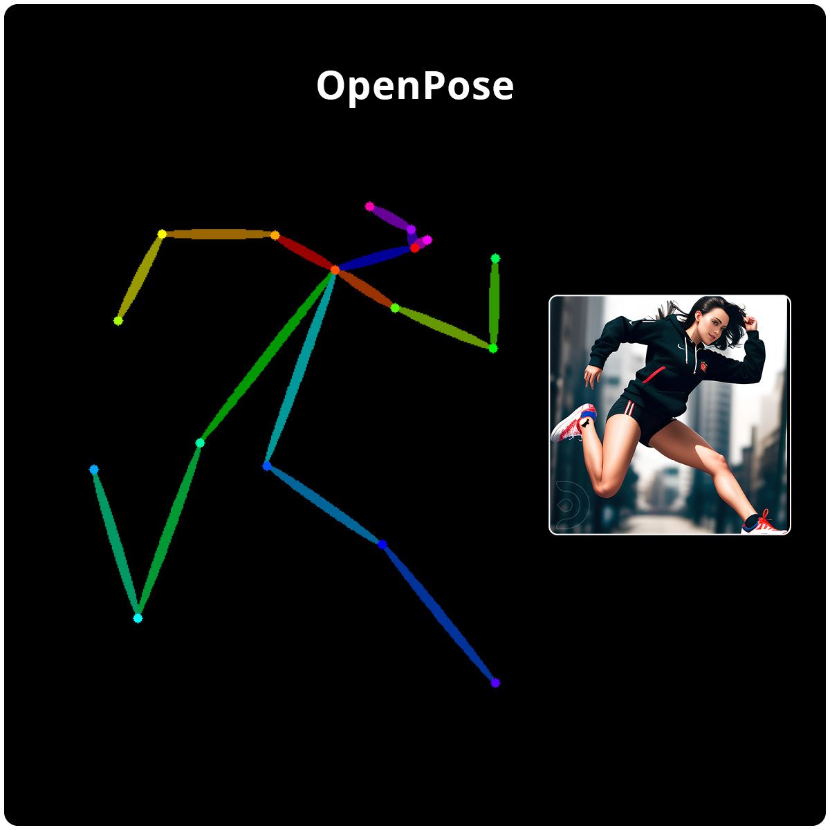 ControlNet OpenPose is a model that uses human pose detection to guide image or video generation by identifying key body points, like the head, arms, legs, hands, and facial features. It creates a skeleton-like "control map" from a reference image and uses it to influence AI models (e.g., Stable Diffusion) to generate new content that matches the pose. This makes it ideal for creating realistic human characters, animations, or scenes with accurate poses and movements.