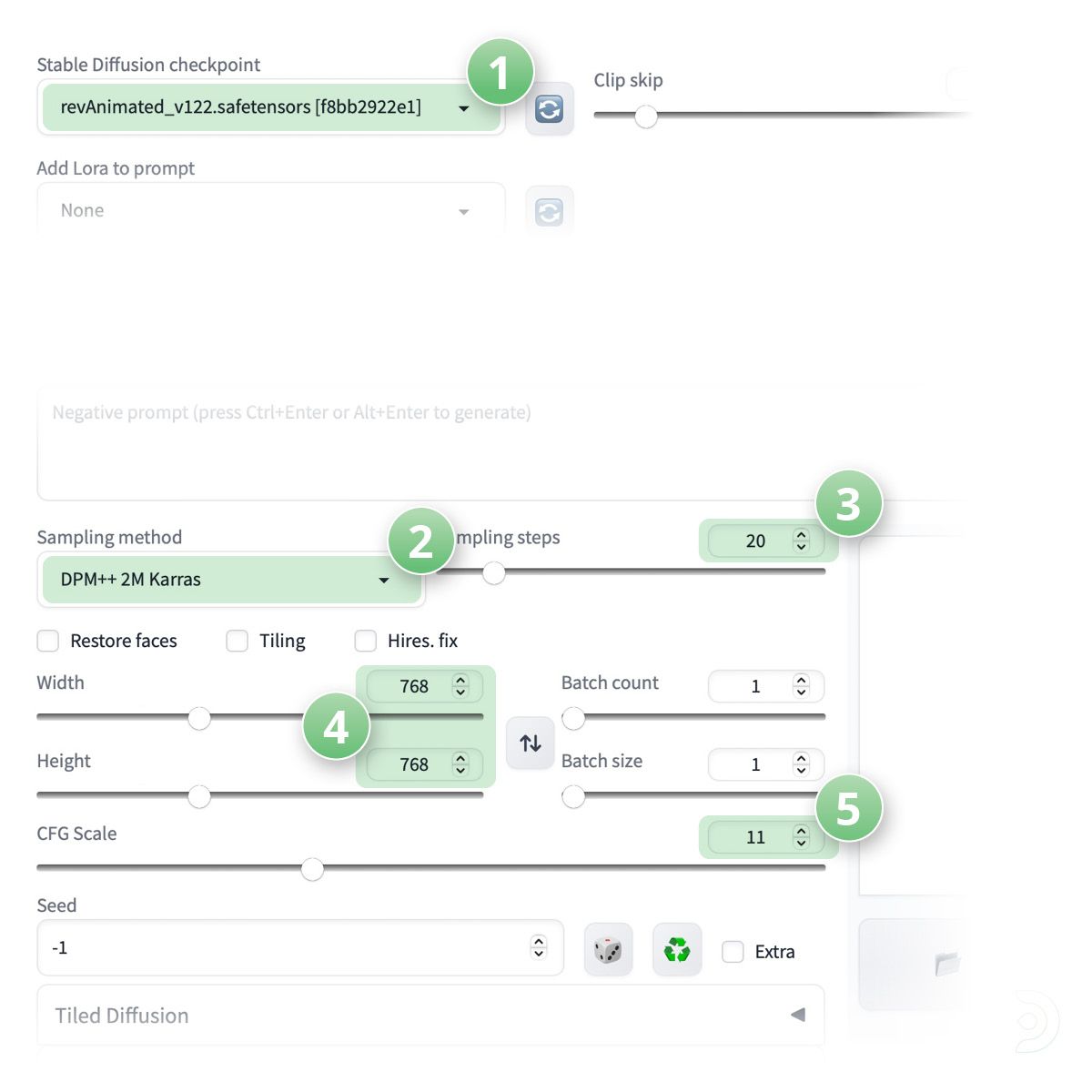 - (1) Set the stable diffusion checkpoint to revAnimated