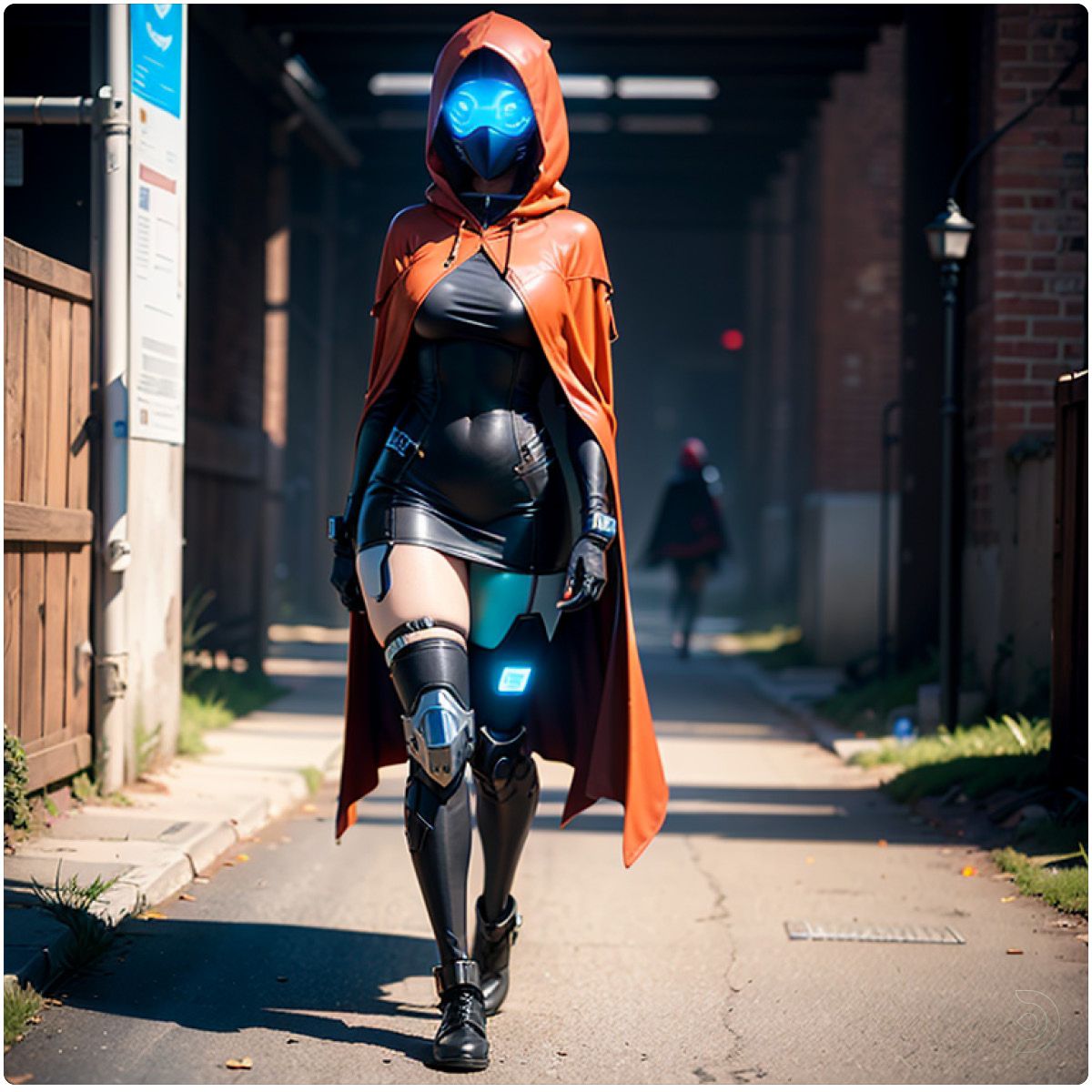 futobot, cyborg, ((masterpiece),(best quality),(ultra-detailed), (full body:1.2), 1 female, solo, hood up, upper body, mask, 1 girl, female focus, black gloves, cloak, long sleeves