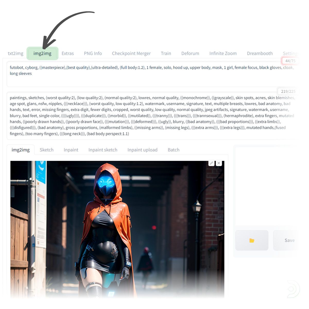 - We can then send this to the img2img tab, or upload your image to the img2img tab if you already have one you want to use. We can enter the same positive and negative prompts.