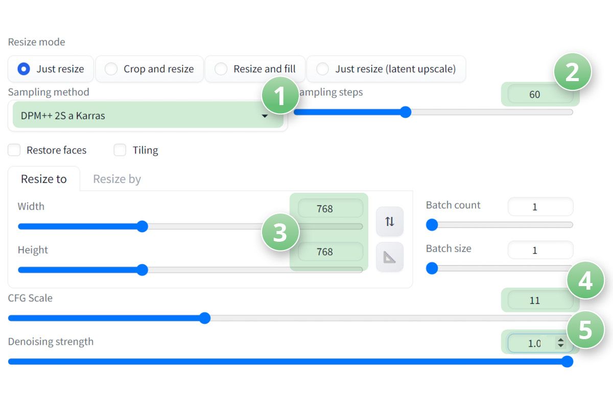 - Can leave Sampling steps at 20. Resolution at 512 x 512