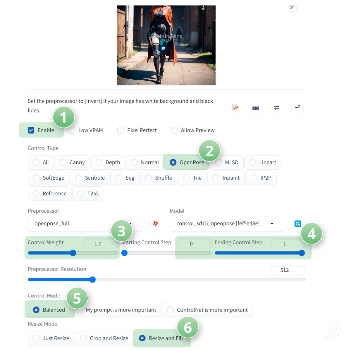 - (2) Select OpenPose as the Control Type, openpose_full as the pre-processor and control_sd15_openpose as the ControlNet model