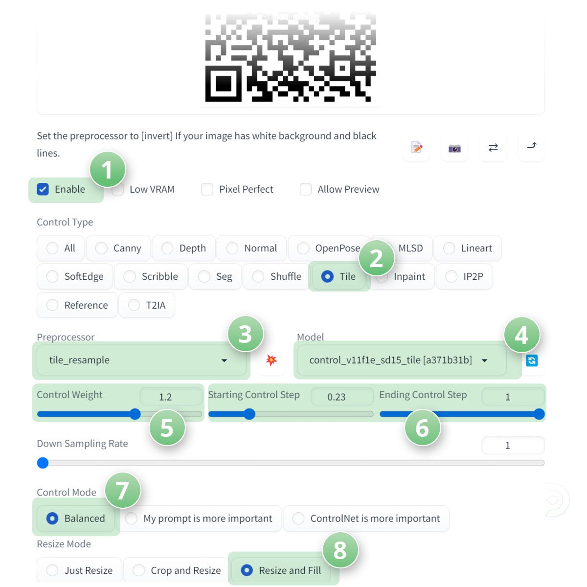 - (5) Set the control weight to 1.2 to inform control net that our QR code is slightly more important than our image!