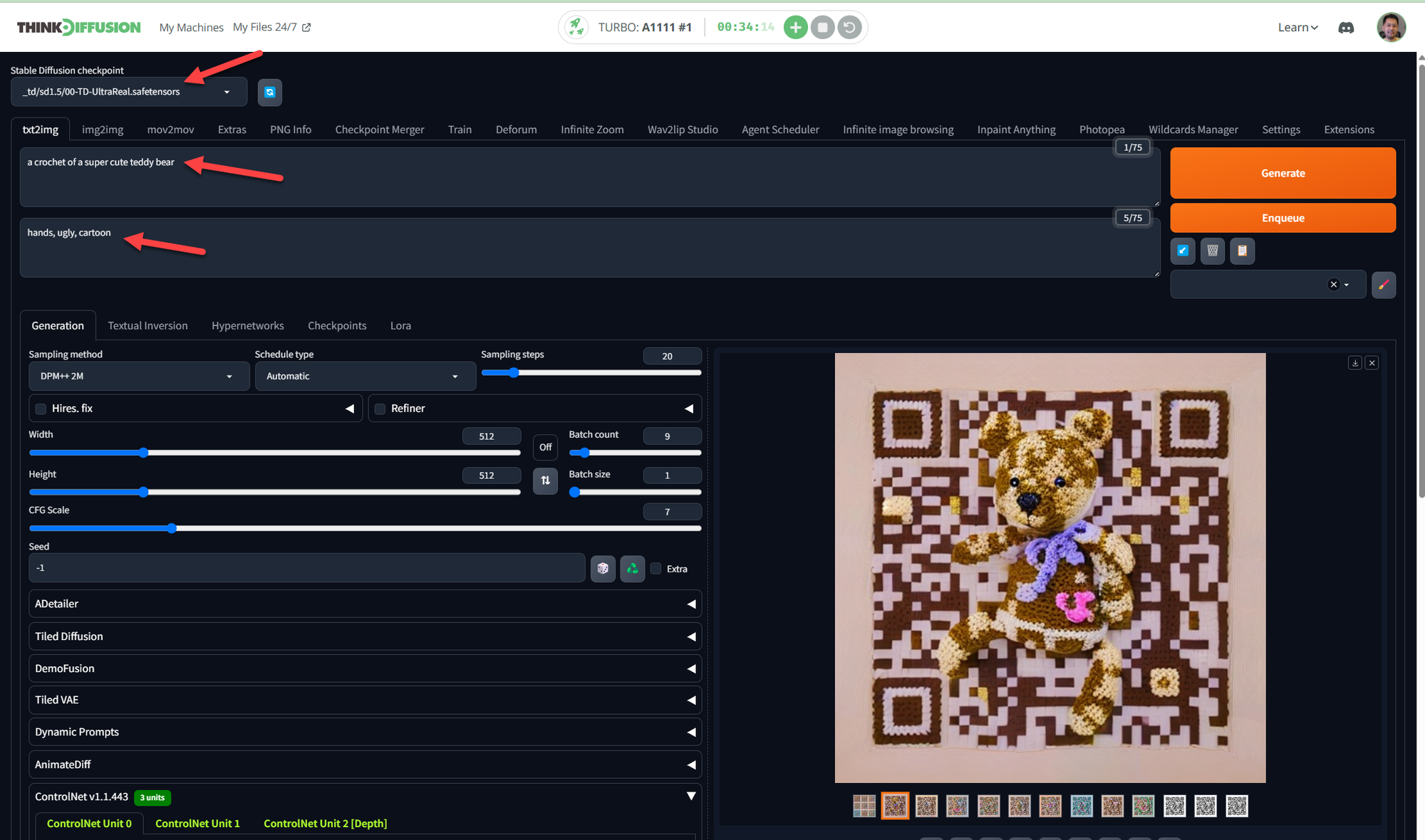 00-TD-UltraReal.safetensorsas the base model in the model selection dropdown. This is a finetuned of Stable Diffusion 1.5 model. - In the txt2image tab, enter prompt of subject. For example: "a crochet of a super cute teddy bear"