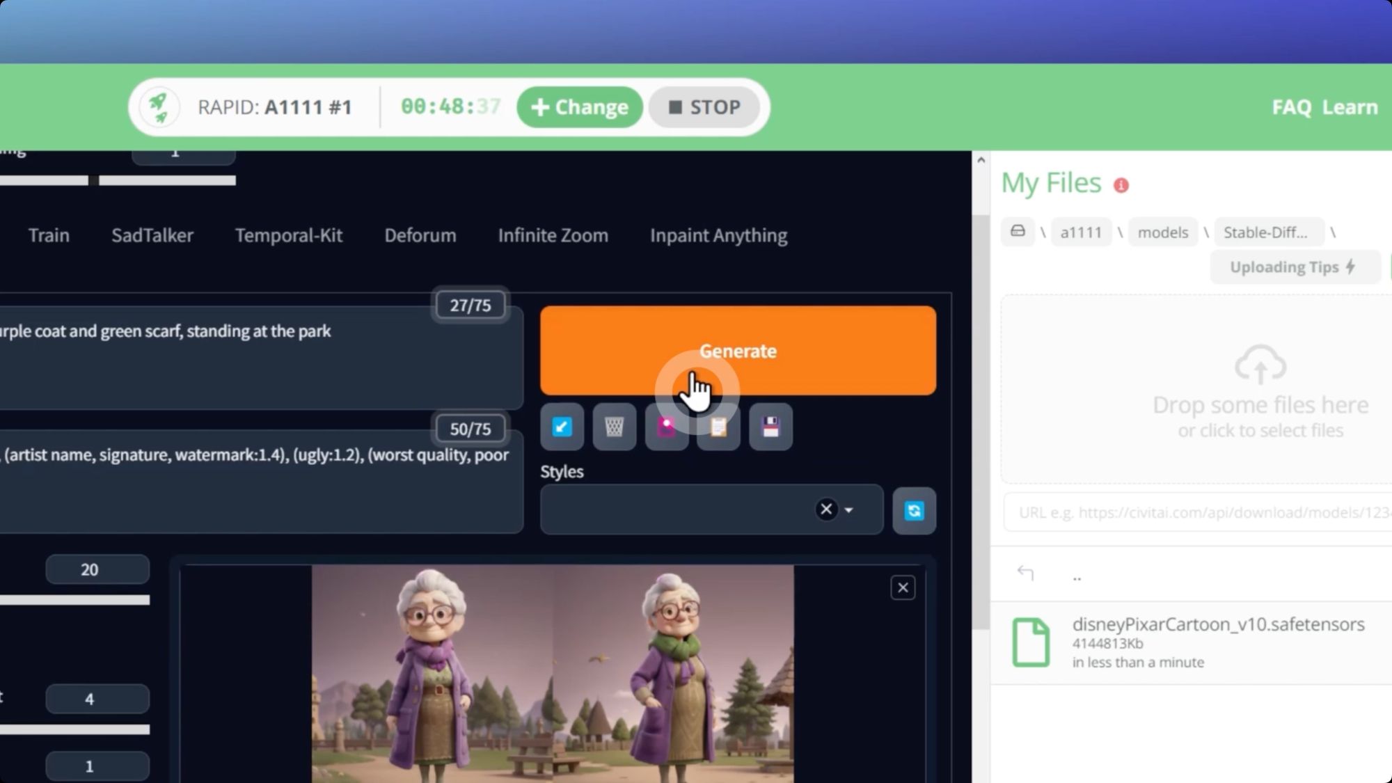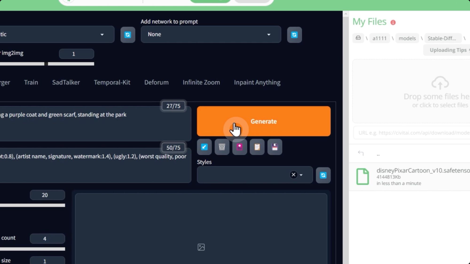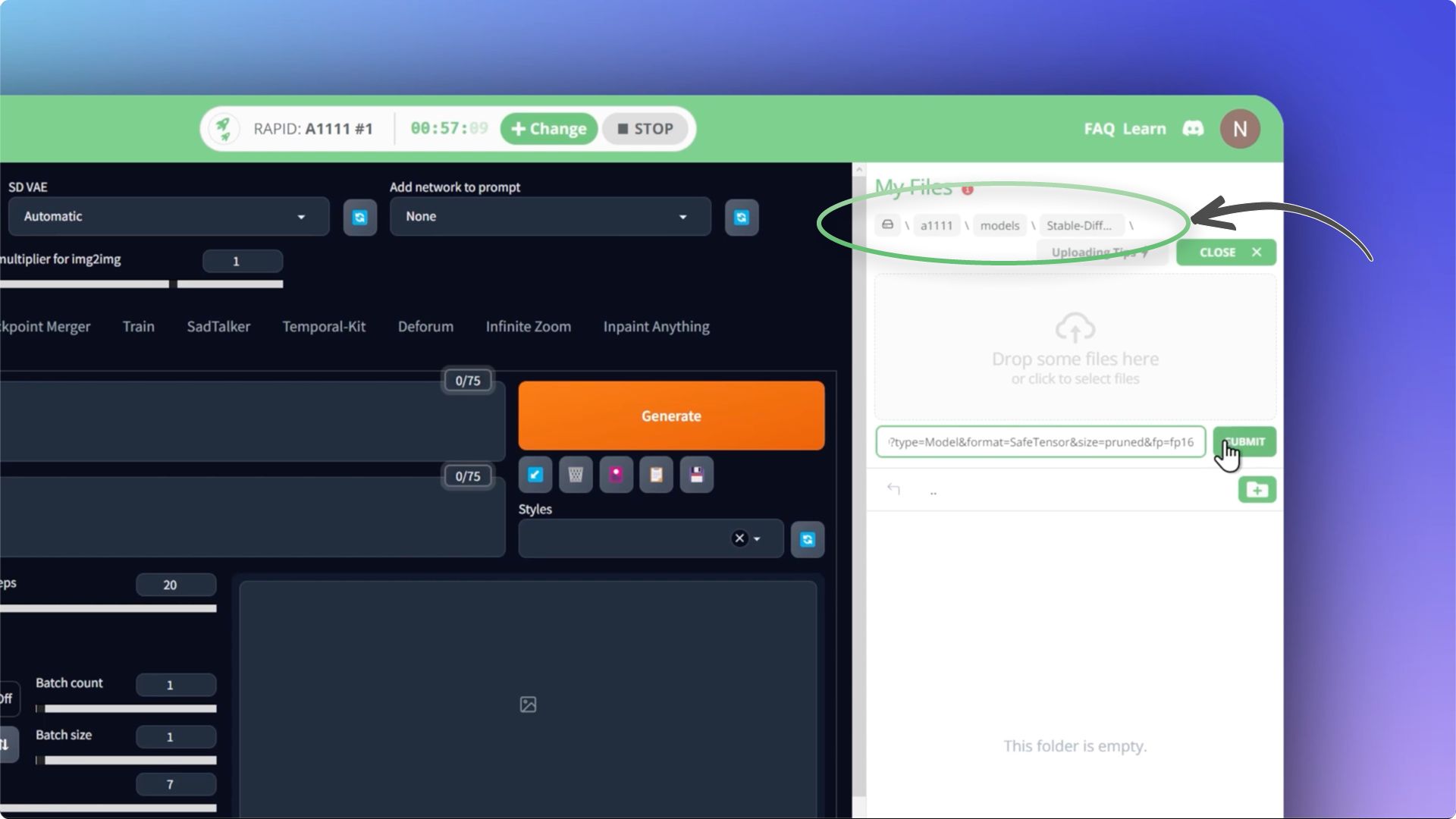 - In this example, to upload a custom checkpoint model by URL, open your My Files panel, and navigate to the following folder: