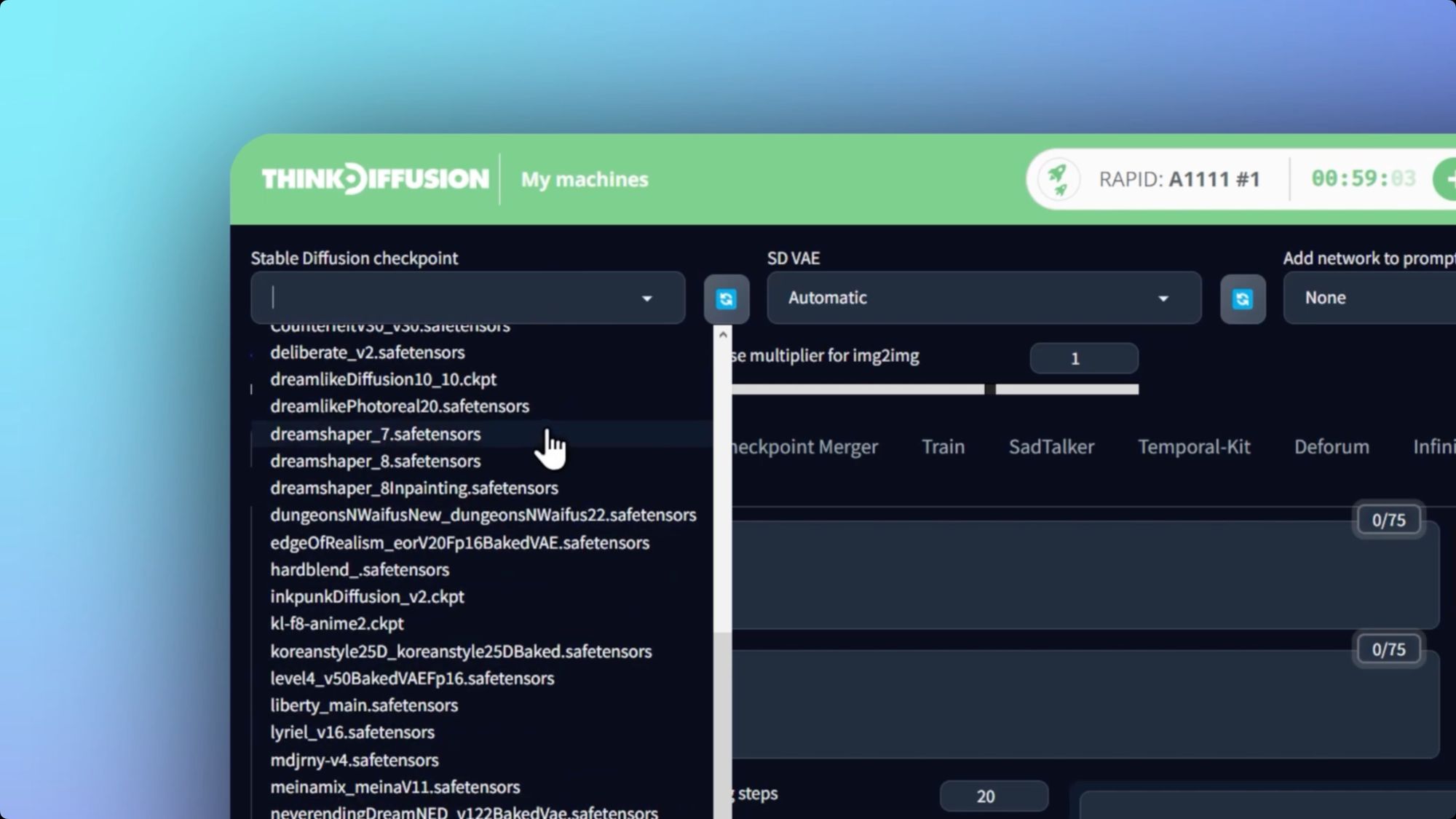 We have more than 50 of the most popular open source models already preloaded - and you can add thousands more from sites like Civitai with just a click.