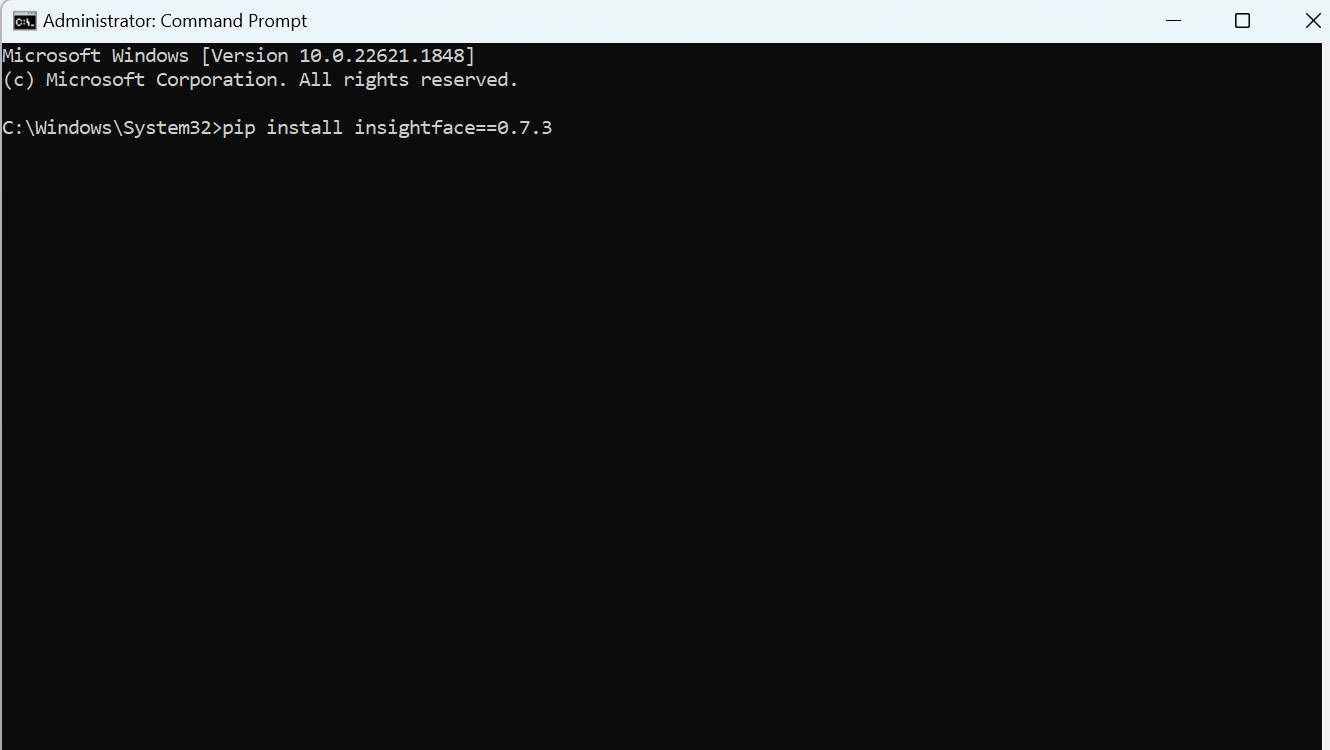 - The next step is to open a command window and run the following command pip install insightface==0.7.3