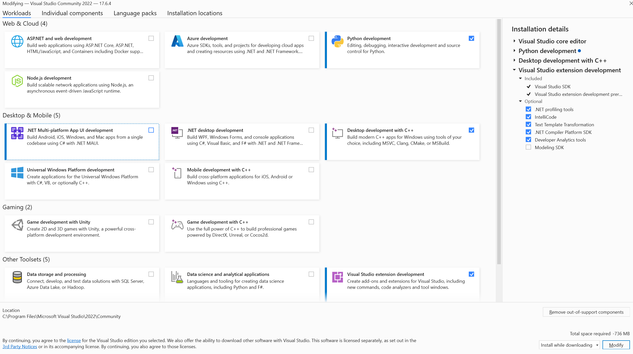 - When installing Visual Studio, make sure to enable Python development, Desktop development with C++ and Visual Studio extension development