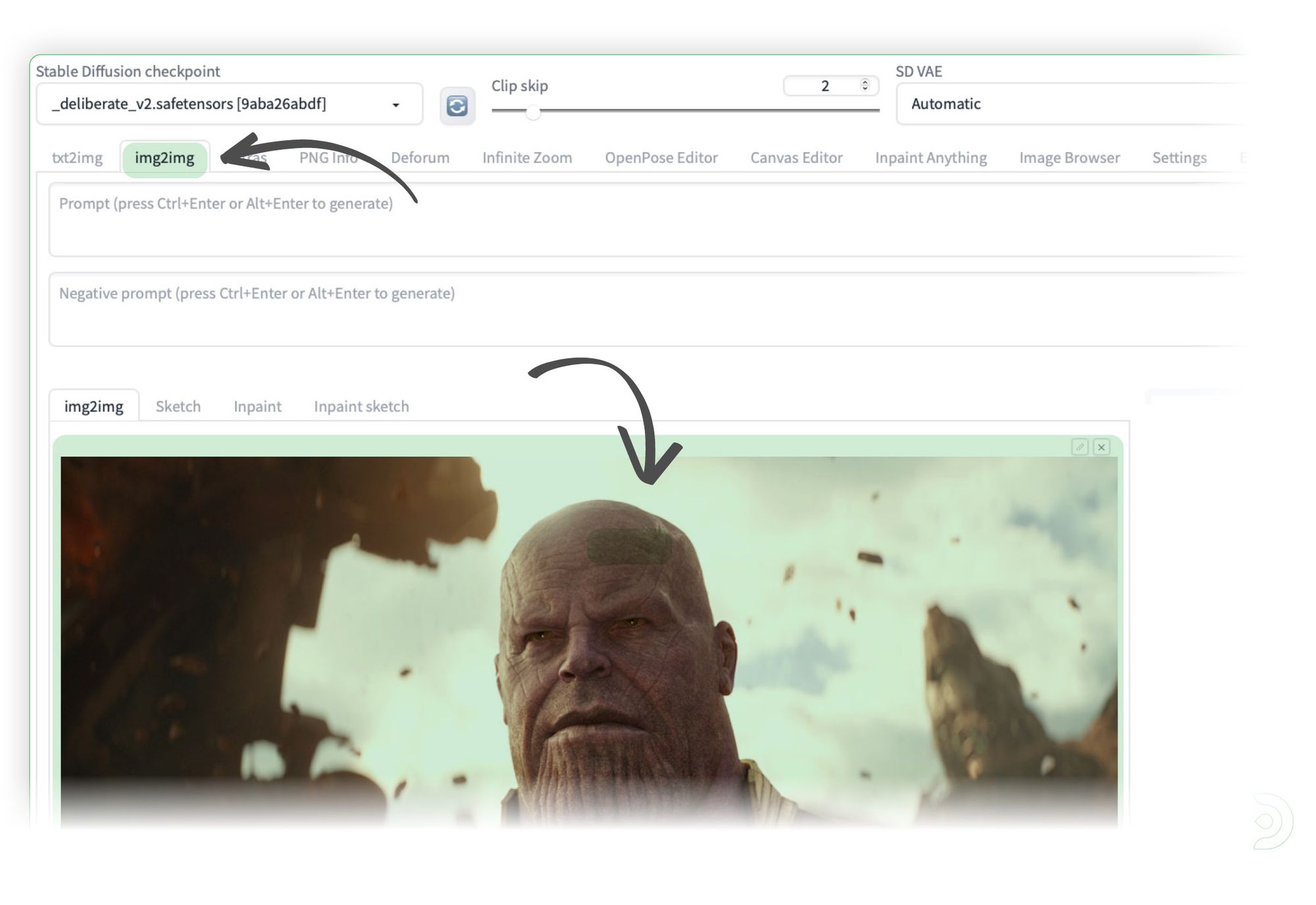 Click over to the Img2img tab and upload the picture of your choice. No need for any prompts.