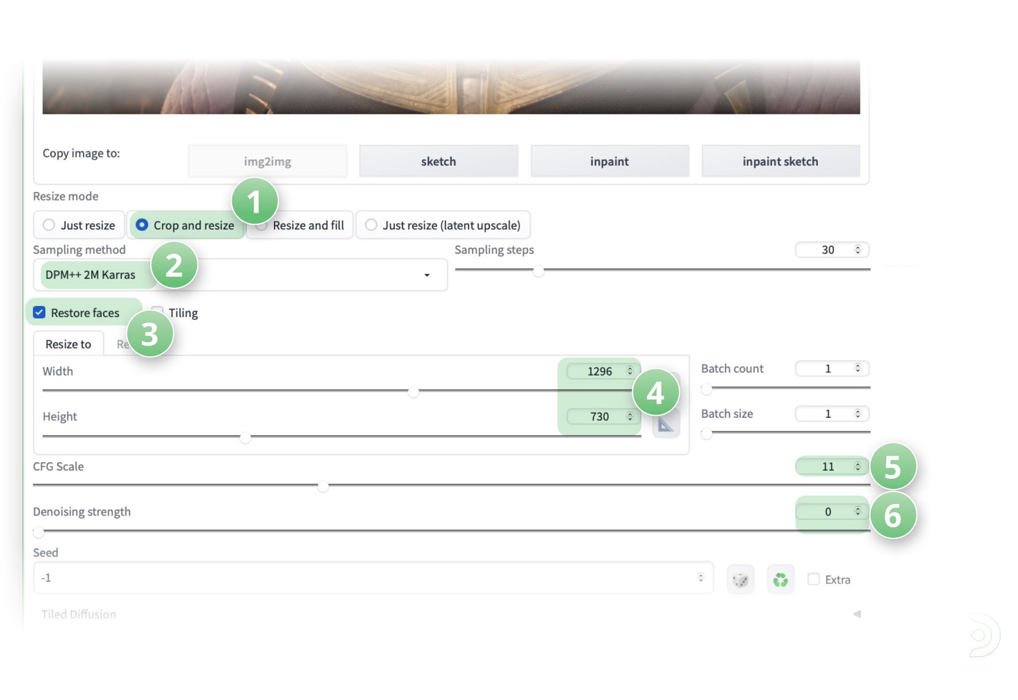 - (6) and the Denoising strength as 0, which is important so SD doesn't try to reimagine the original image.