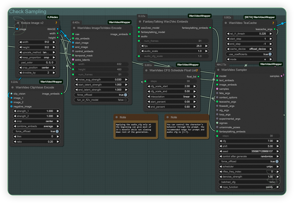 | 4. Check Sampling Check the sampling settings on the image. For more dynamic body movements,set the CFG to higher than 10 but it may appear an artifacts. Higher CFG and using unquantized model works best only in 60GB VRAM. |