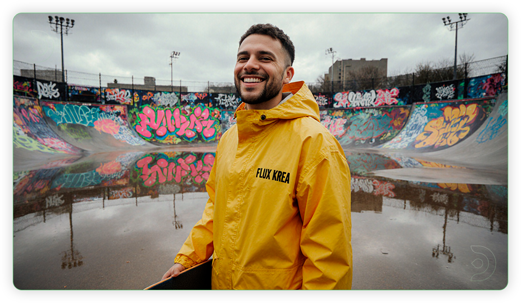 Prompt: A realistic person wearing a bright yellow raincoat stands smiling near the right edge of a wide, landscape-oriented frame. The background is a vibrant urban skatepark, with colorful ramps and graffiti, set after a rain—puddles reflecting bold street art and cloudy sky. The person has authentic skin texture and natural facial features, fully clothed (no topless or naked appearance), and holds a skateboard with one hand. The words "Flux Krea" are clearly visible as part on the clothing. Lighting is soft and natural, with realistic shadows and reflections. No plasticky skin, no overly smooth surfaces, no AI artifacts, no uncanny valley. The composition is dynamic and wide, blending urban energy with lifelike detail. Highly detailed, organic, and human appearance