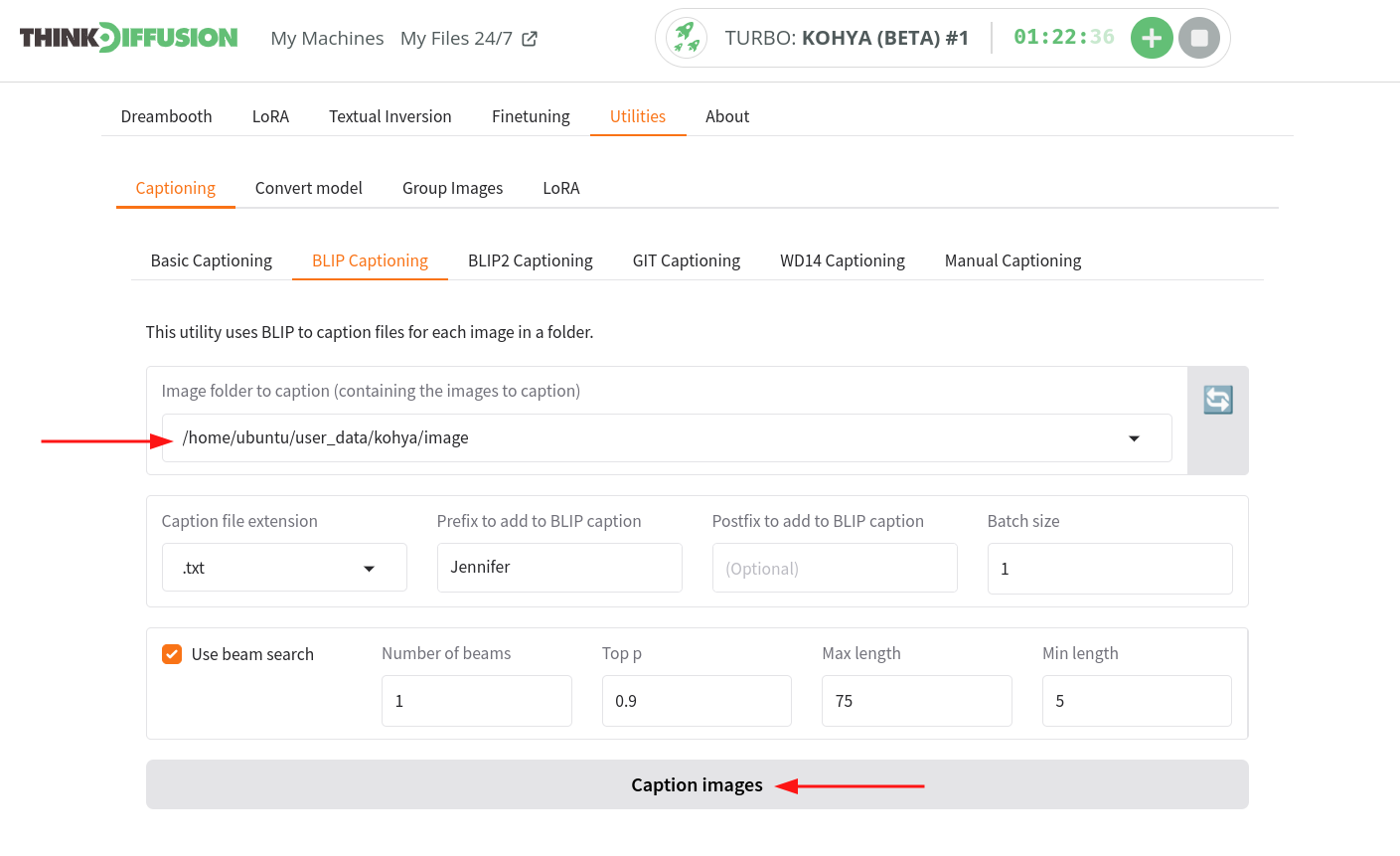 Image folder to caption tab (containing the images to caption)field. - Provide the prefix to be used to BLIP caption the images. For example - “Jennifer”
