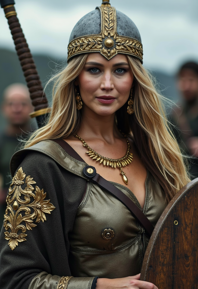 - Positive prompt: cinematic photo of a woman with dry skin and battle scars viking in viking warrior armor and helmet, wearing viking golden ornamented jewelry. She is carrying a viking wooden shield and iron sword.