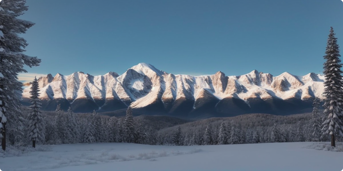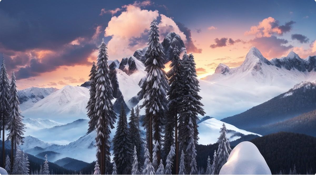 - snowy mountains, beautiful sunrise, trees, 4k, ultra detailed, masterpiece