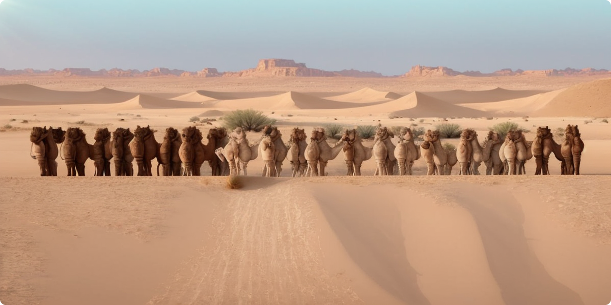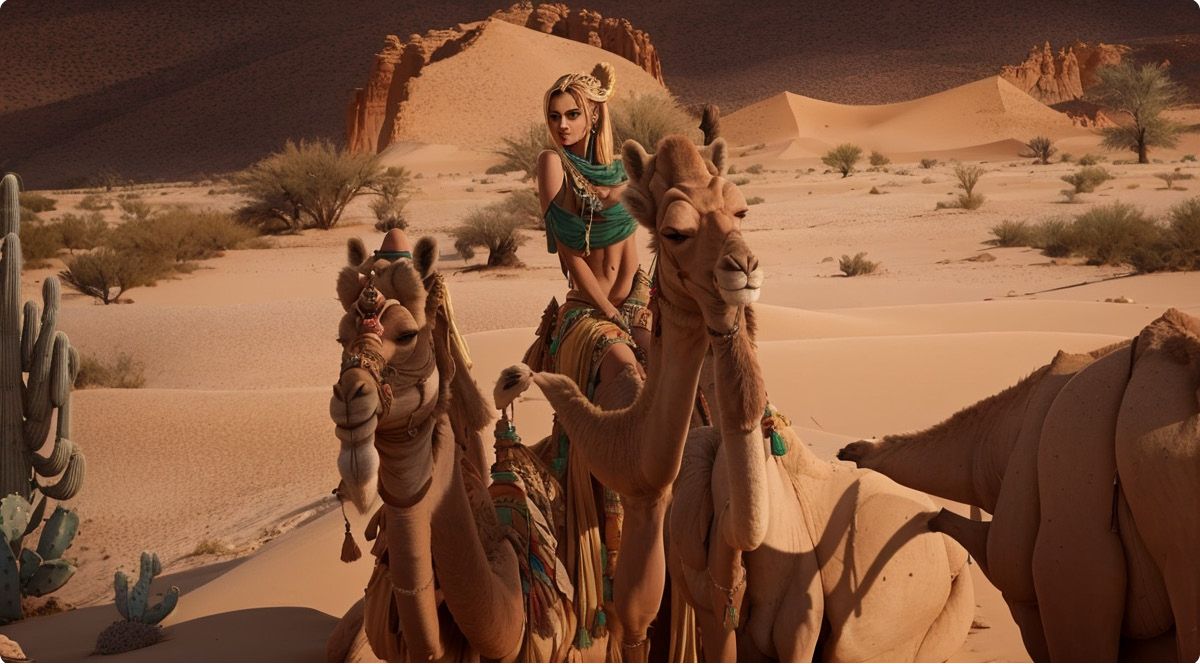 - Sandy desert, beautiful light, camels, cactus, 4k, ultra detailed, masterpiece