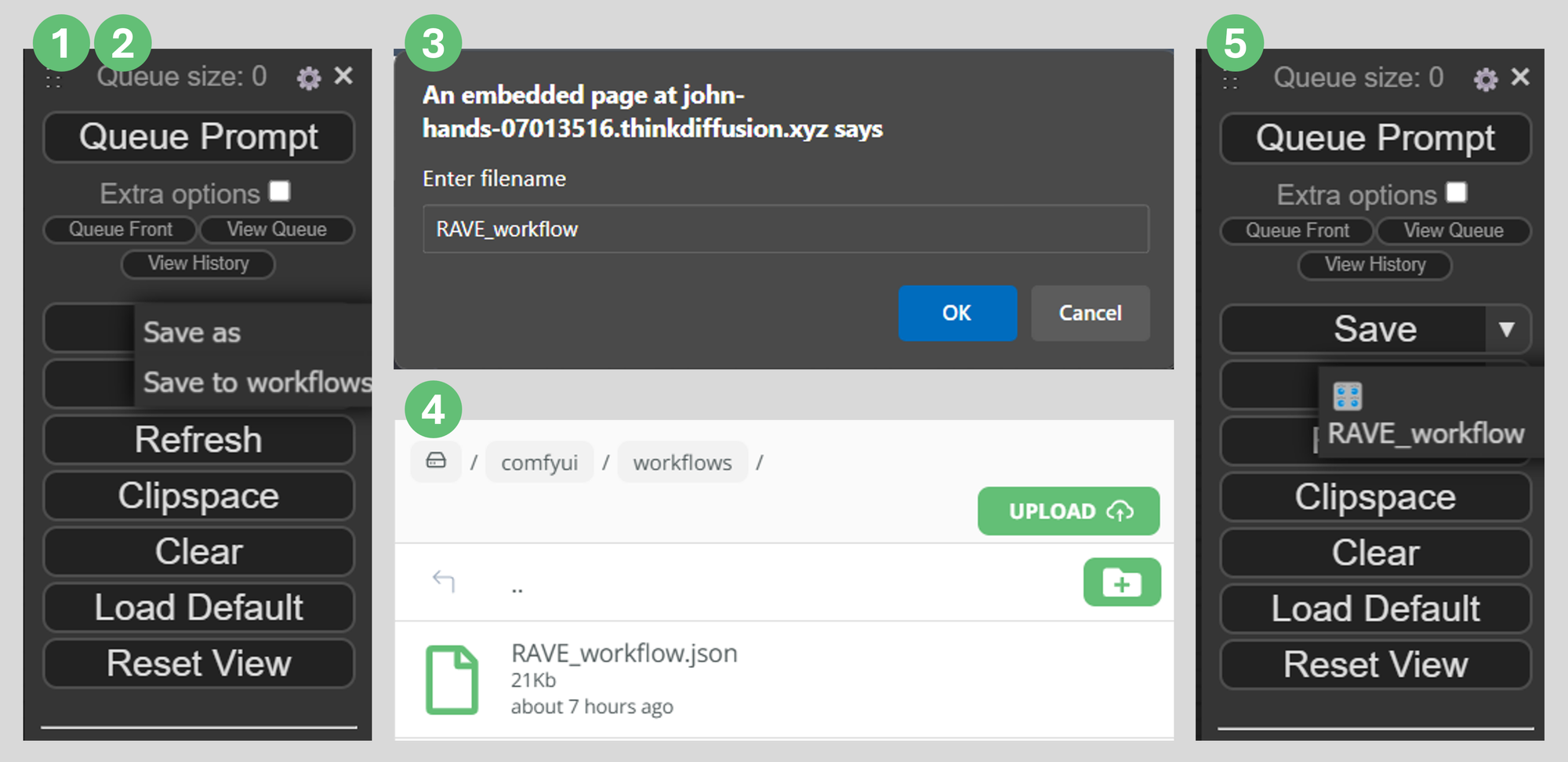 Save to workflowsto save it to your cloud storage/comfyui/workflowsfolder. - Enter a file name. No need to include an extension, ComfyUi will save it as a