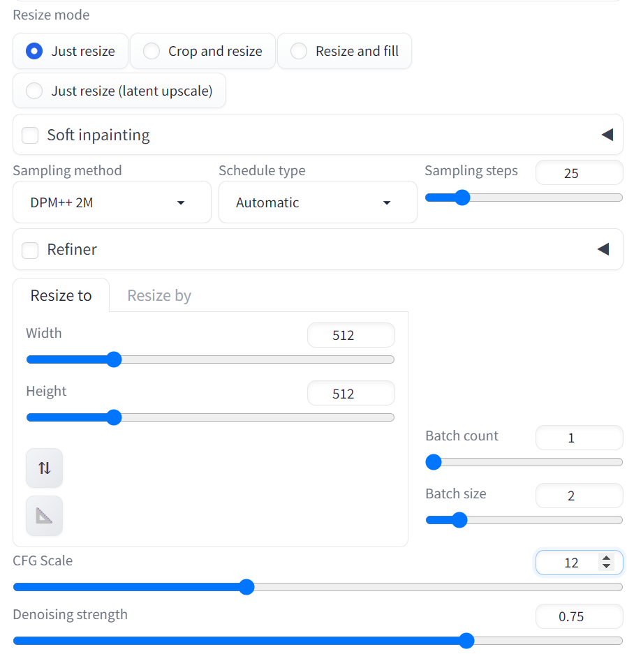 - Denoising Strength: Start with 0.75