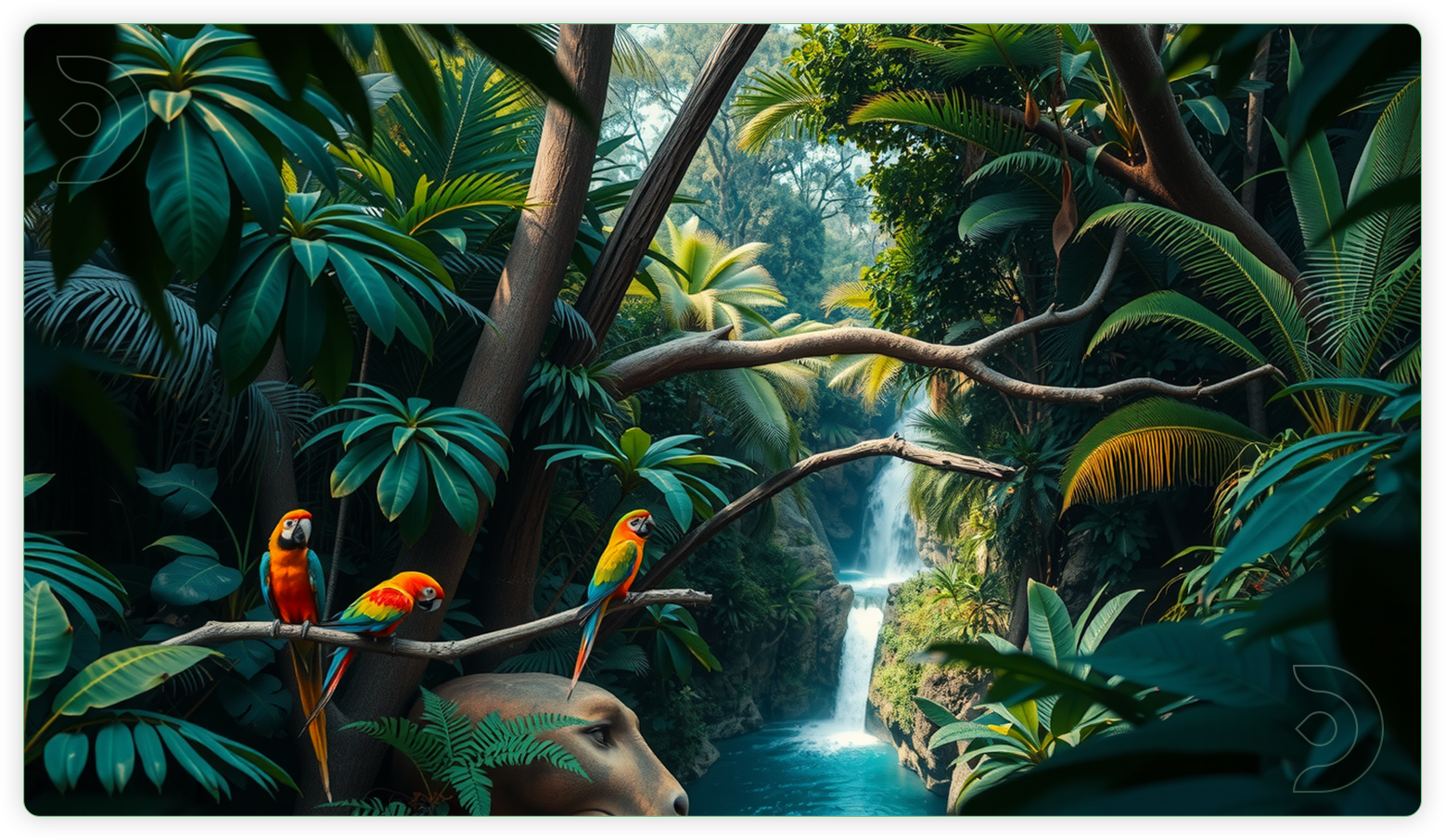 Prompt - A dense jungle filled with exotic wildlife and towering trees. Parrots chatter from the canopy, and a narrow trail winds through thick foliage to a hidden waterfall cascading into a crystal-clear pool.