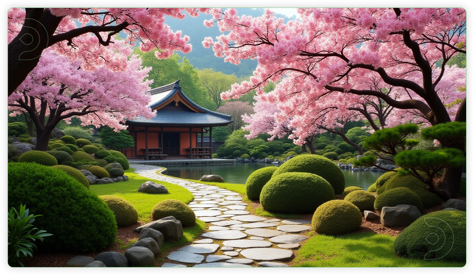 Prompt - A serene Japanese garden in springtime, complete with cherry blossoms in full bloom. A stone path winds through manicured greenery, leading to a tranquil koi pond and a traditional tea house.