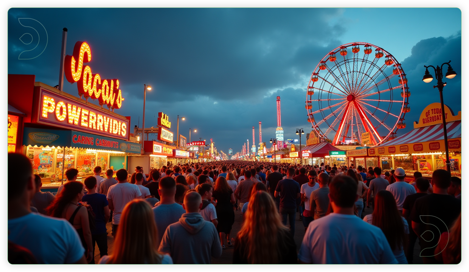Prompt - A crowded carnival at dusk, with the sounds of laughter and the smell of popcorn in the air. Brightly colored rides and game booths line the midway, and the Ferris wheel lights up against the darkening sky.
