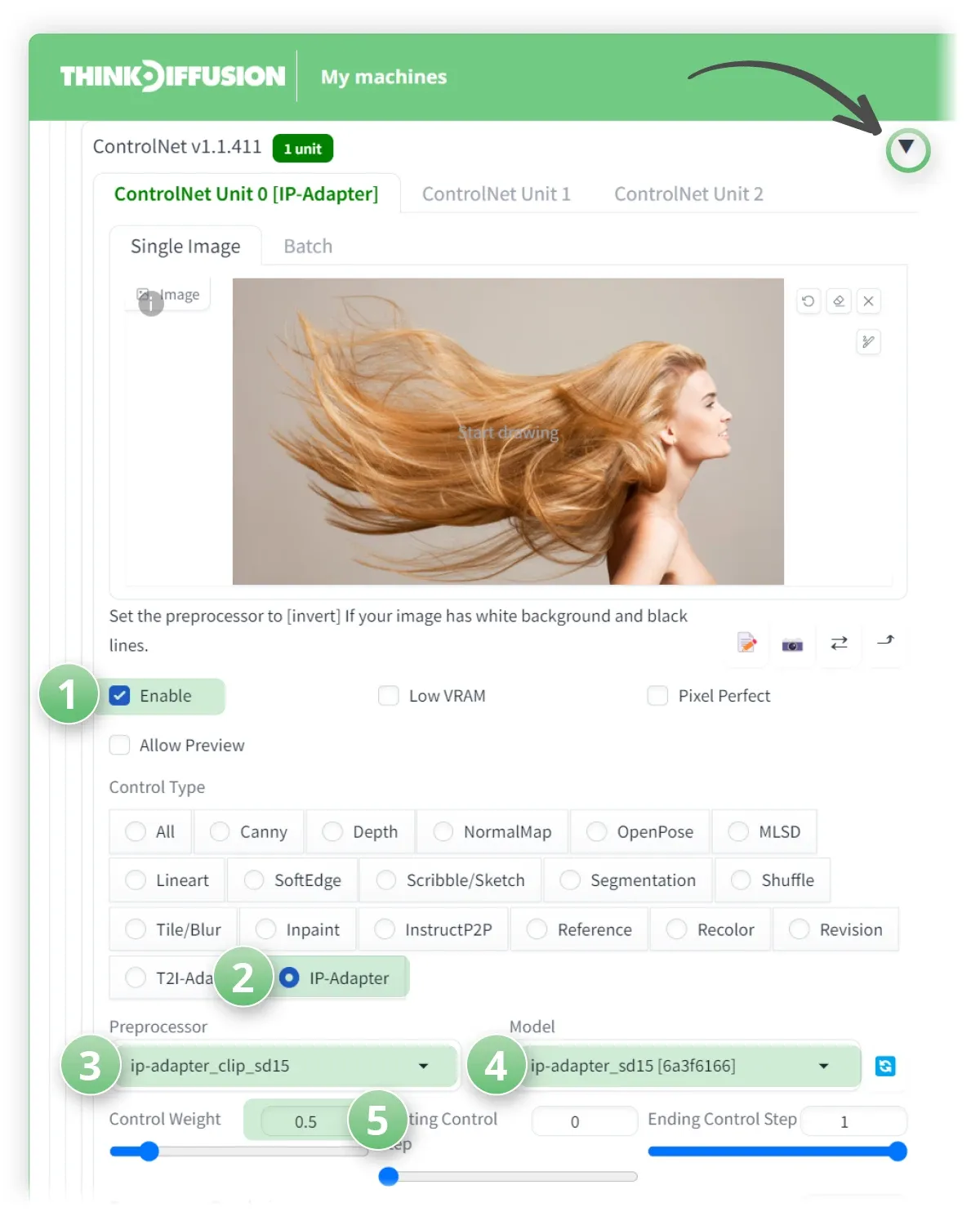 - (4) Set the ControlNet model to ip-adapter_sd15