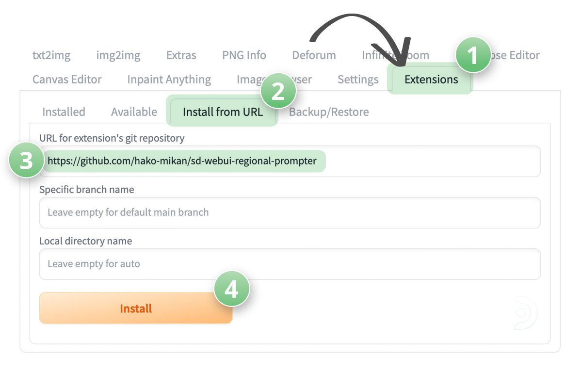 - The Regional Prompter can be installed by copying the following url from GitHub and https://github.com/hako-mikan/sd-webui-regional-prompter