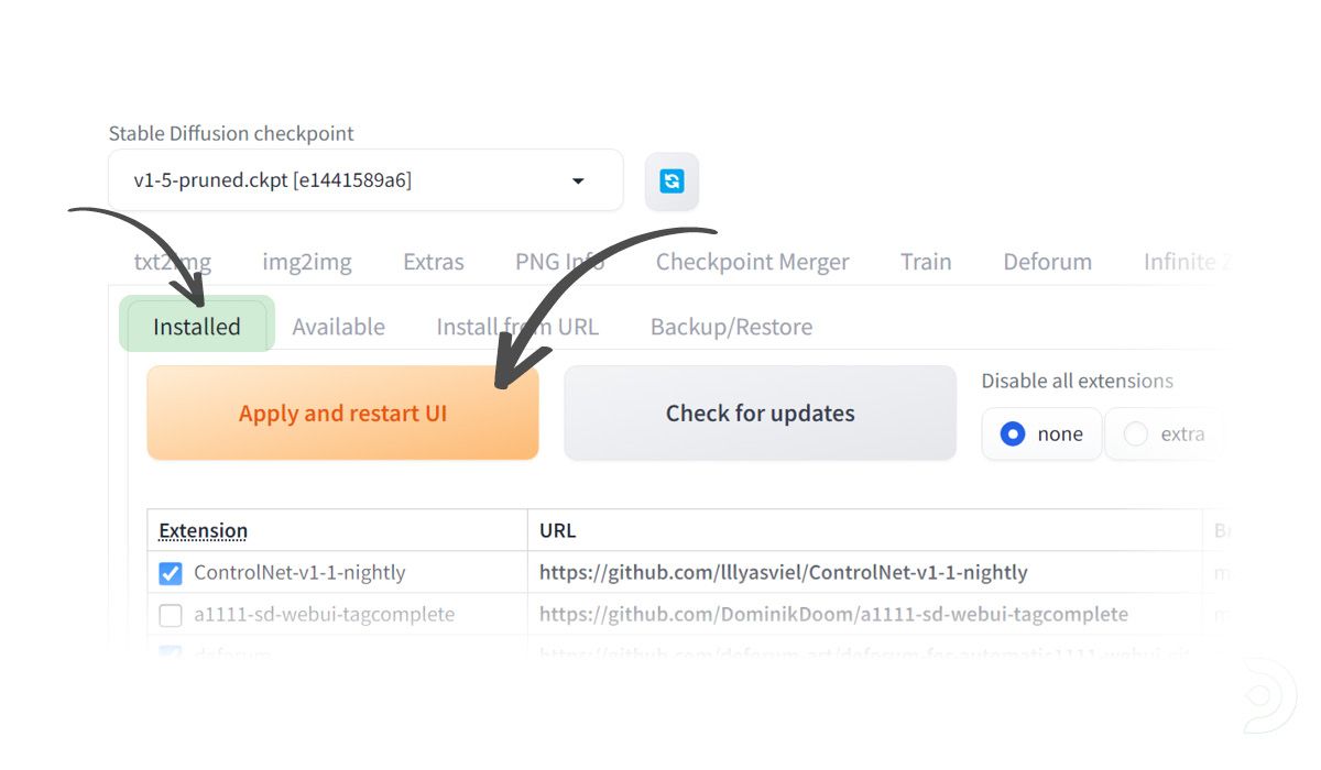 - Click Install and then go to the installed tab and click apply and restart UI for the changes to take effect. If you do not see the regional prompter on the txt2Img tab then you may need to completely restart your instance of stable diffusion