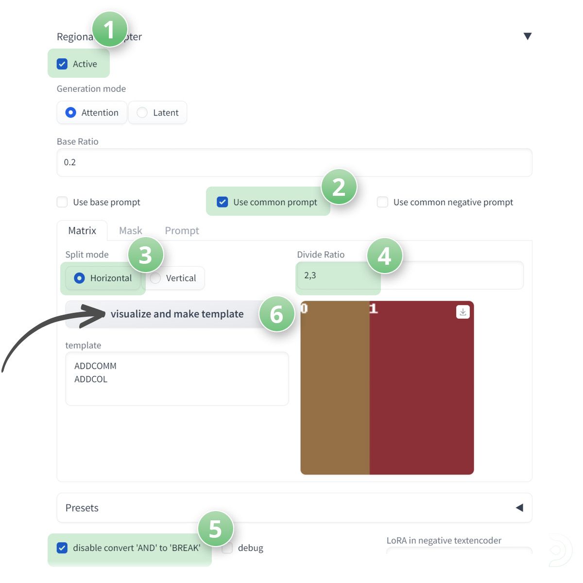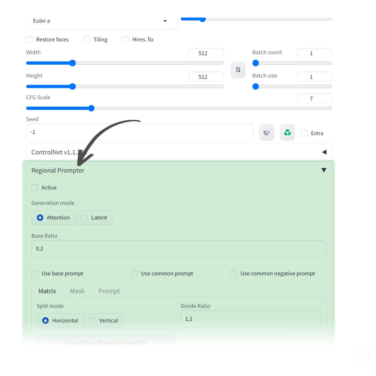 We can use regional prompter to help us with lighting. On the txt2Img tab I will enter the following settings: