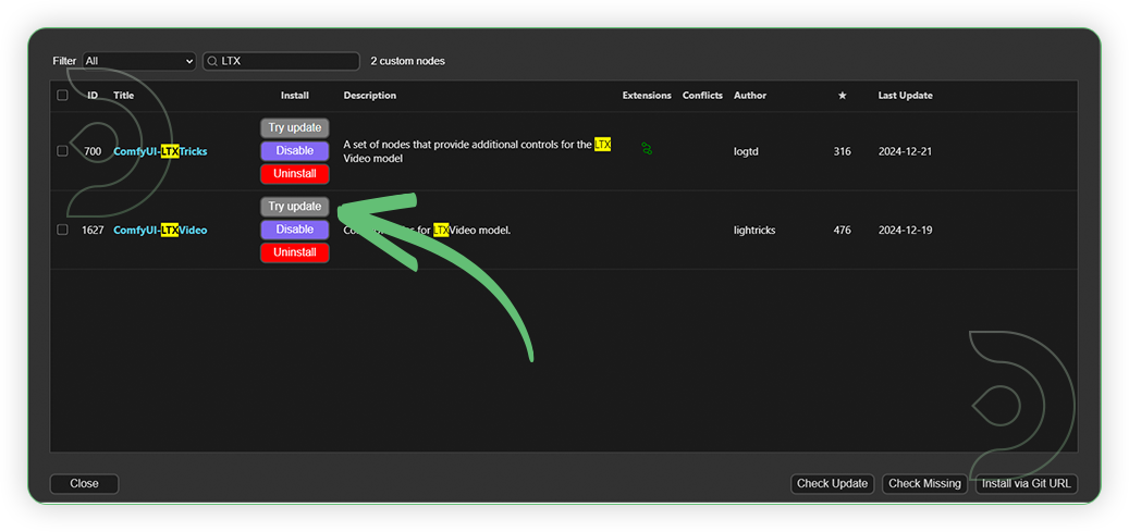 - If your list of missing custom nodes is empty, you might already have LTX installed but an older version. Go to Custom Nodes Manager.