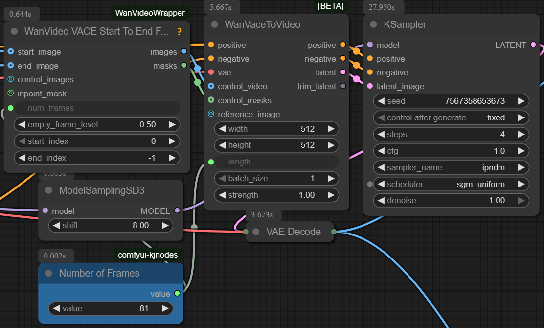 T2V mode: Bypass "end frame", "start frame" and the "VACEFirstToLastFrame" node. Set strength to 0 for WanVaceToVideo.
