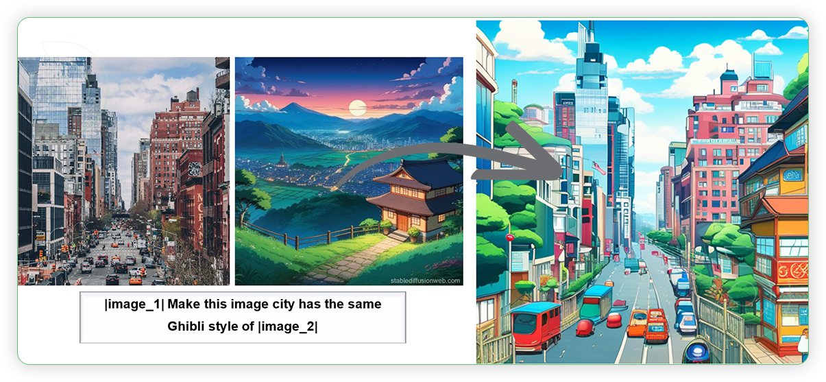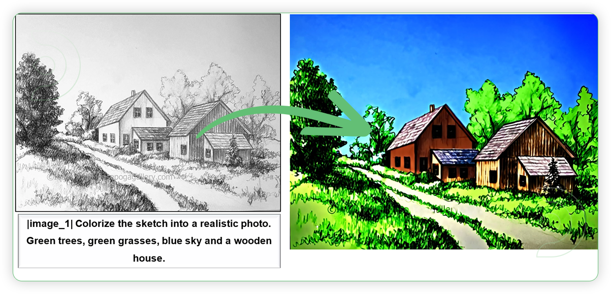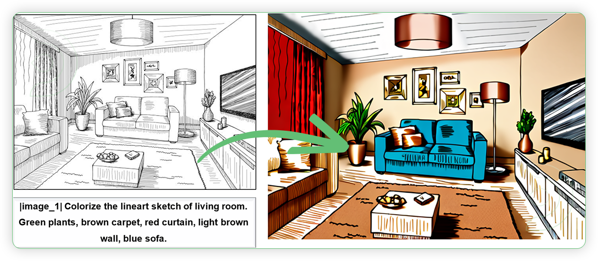 | 2. Write a Prompt When writing the prompt, there is a standard format of prompt. It must include placeholder image_i represents the position of the i-th image. Should have vertical bar before and after of placeholder word. Example: |image_1| Colorize the lineart sketch of living room into a realistic photo. Green plants, brown carpet, red curtain, light brown ceiling, blue sofa, light brown wall |