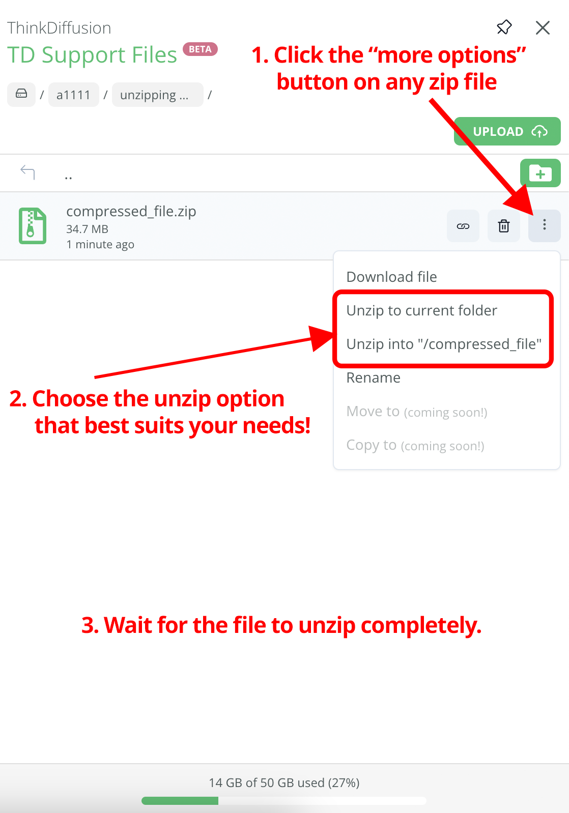 - Unzip into "/zip_file_name" will create a folder with the same name as the zip file, and the zip contents will be extracted inside.