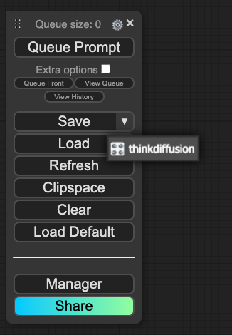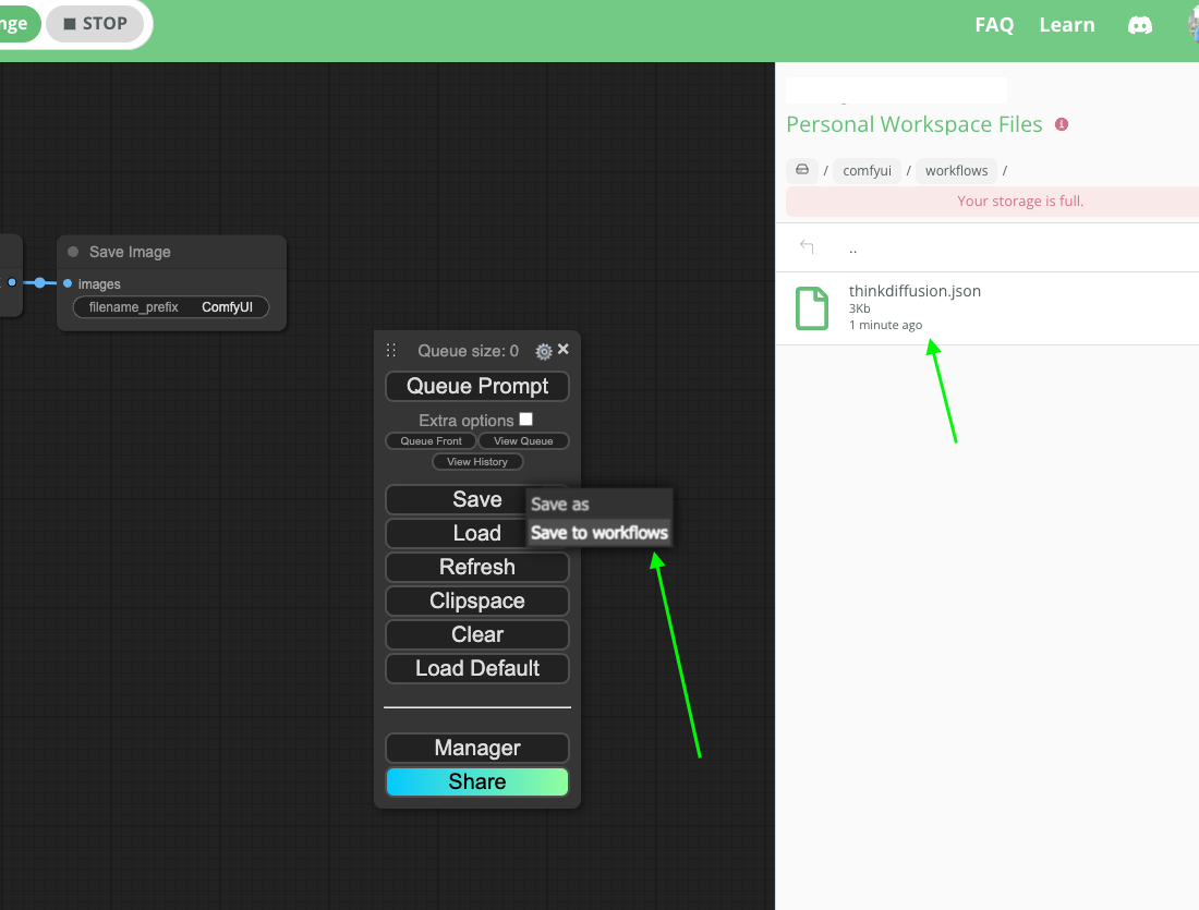 To save current workflow into Thinkdiffusion file browser, you can click on the save dropdown(as shown in the screenshot below) & click on Save to workflows, saved workflow can be found inside comfyui/workflows.