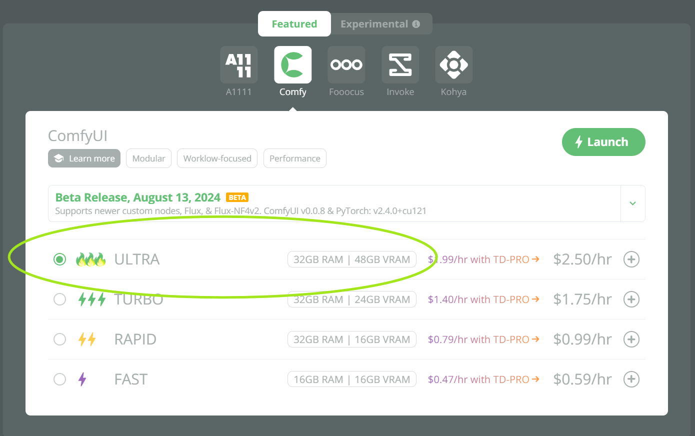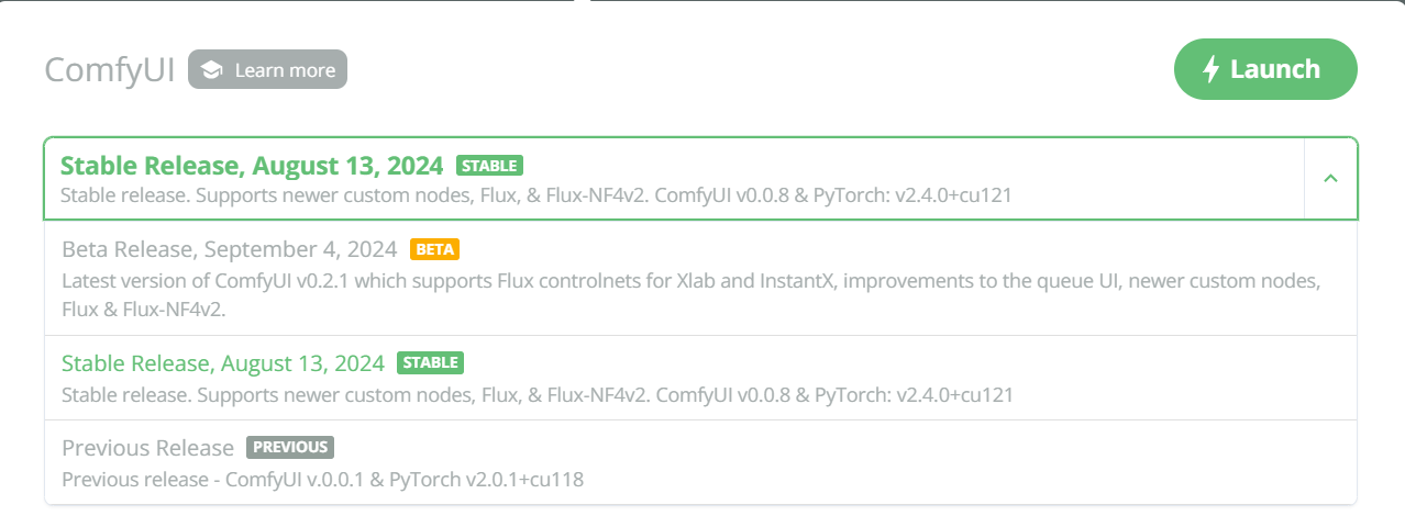 We've updated our ComfyUI versions with a new Beta version to support SD3.5. Additionally, all ComfyUI versions include performance fixes. Loading large models, such as Flux, should be noticeably faster (~2 mins instead of 10+ mins).