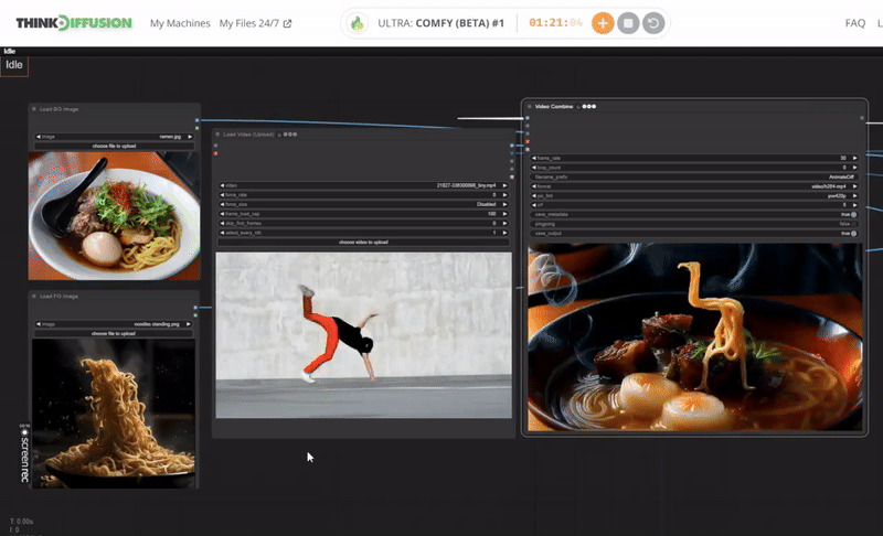 Follow this guide and you can create your own dancing noodle video with ThinkDiffusion. To produce a video of dancing noodles using artificial intelligence, begin by generating a noodle dance using the picture of a noodle and background of ramen bowl within the ComfyUI interface. Subsequently, employ an AI-driven animatediff, ipadapter and controlnet nodes to imbue the noodles with dancing movements. Assemble the animations using a video editing software like Adobe, which allows you to include backgrounds, synchronize music and finetune your result.