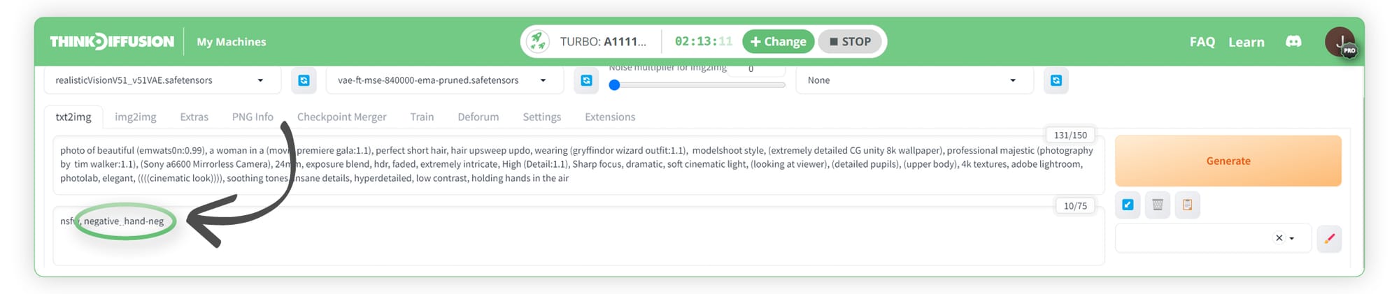 We can then adjust our negative prompt to add in the following trigger word negative_hand-neg
