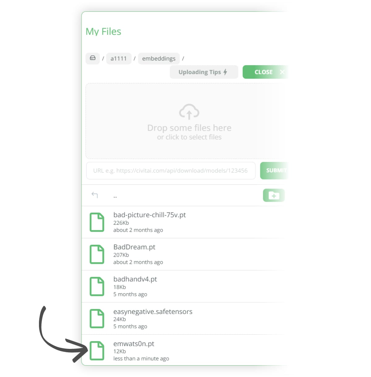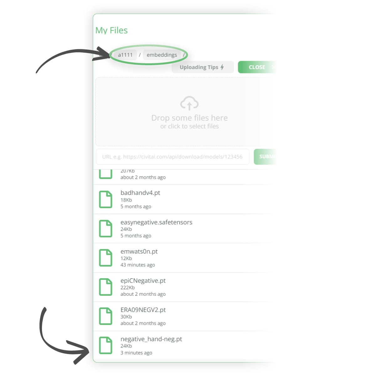 To try and help fix this issue, we can download the following negative hand embedding from here: https://civitai.com/models/56519?modelVersionId=60938 Follow the previous steps to upload the file to the following folder, ../user_data/a1111/embeddings/ as shown in the images below:-