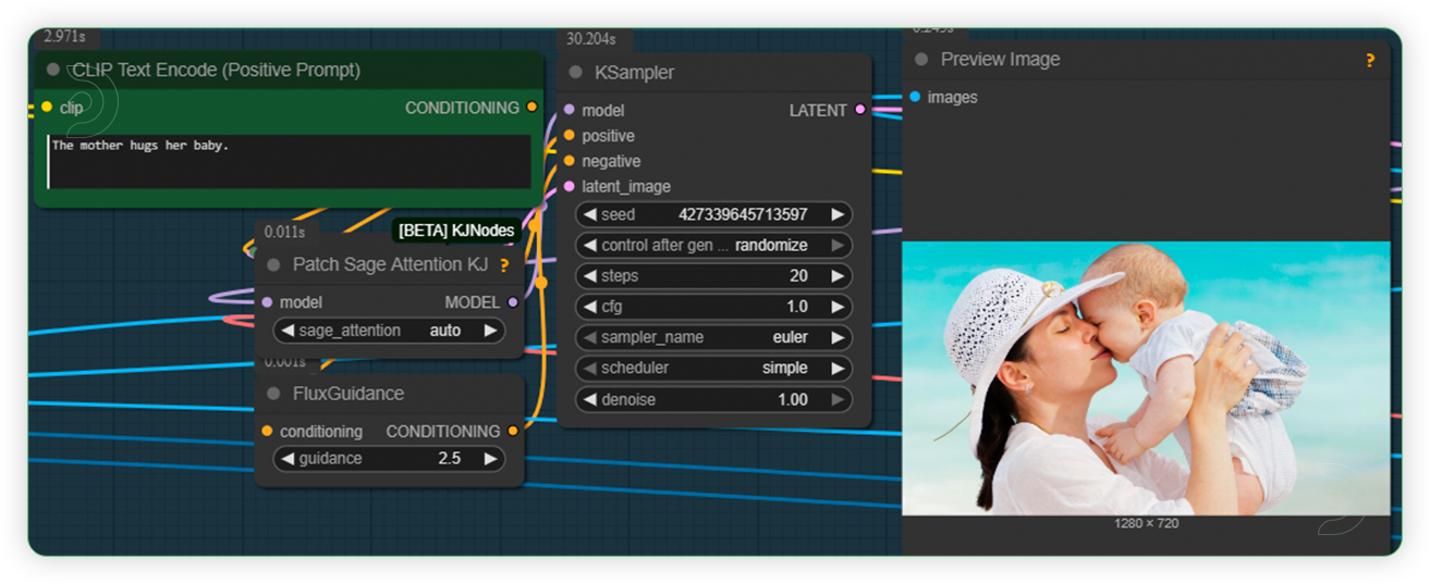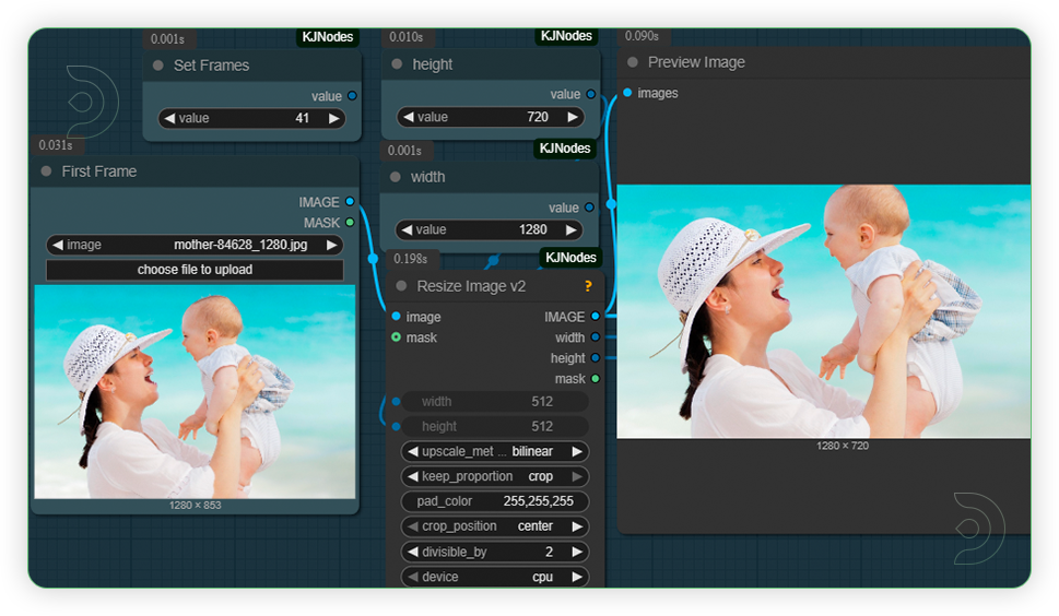 Think of it as directing a movie scene where you define the beginning and ending poses, and the AI fills in all the natural movement between them. Whether you want a mother lifting her baby into an embrace, a flower blooming to reveal something magical, or a peaceful landscape transforming dramatically, this workflow handles the complex interpolation while keeping everything visually coherent.