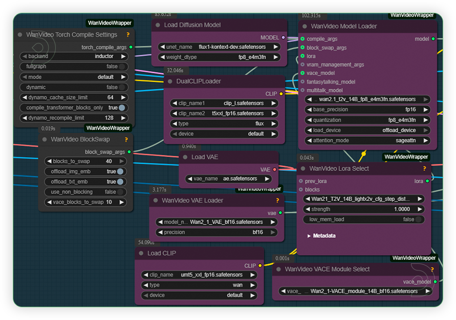 ComfyUI v0.3.44 with the use flux1-kontext-dev.safetensors, wan2.1_t2v_14B_fp8_e4m3fn.safetensors, and Wan2_1-VACE_module_14B_fp8_e4m3fn.safetensors