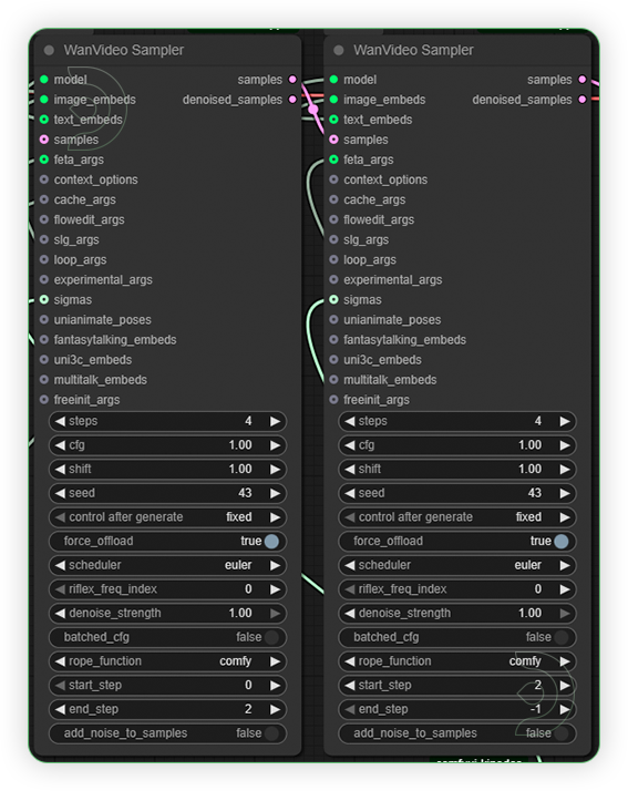 | 3. Check Sampling Set the sampling setting as seen on the image. Since it uses a lightning x2v lora, the inference steps should be at 4 only. Otherwise, it will result to an error. |