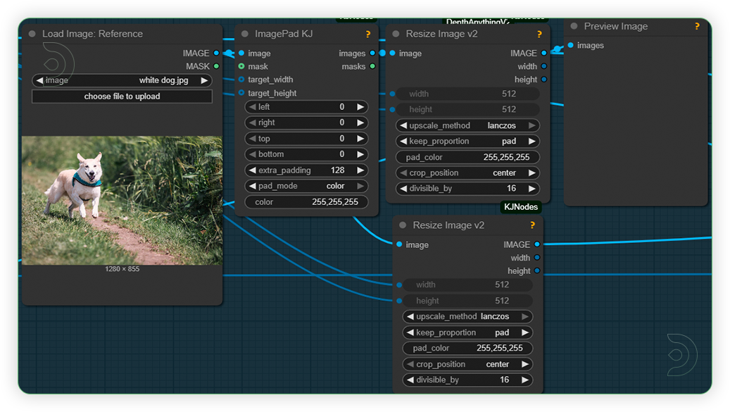 | 3. Load Image as Reference for Video Load a reference image for the subject of the video. Image should be clear and shows a subject such as person, animal, moving things. The extrapadding is how large the outpainted area of the video will be. |