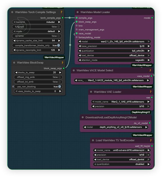 | 1. Set the Models Set the models as seen on the image. 14B base model should be paired with 14B VACE model. If you have sageattn installed, use the sdpa. |