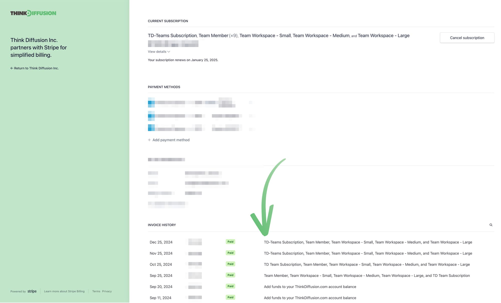 You can always find and download your invoices on the Stripe Billing page by clicking "Manage Billing" at the bottom of your admin panel.