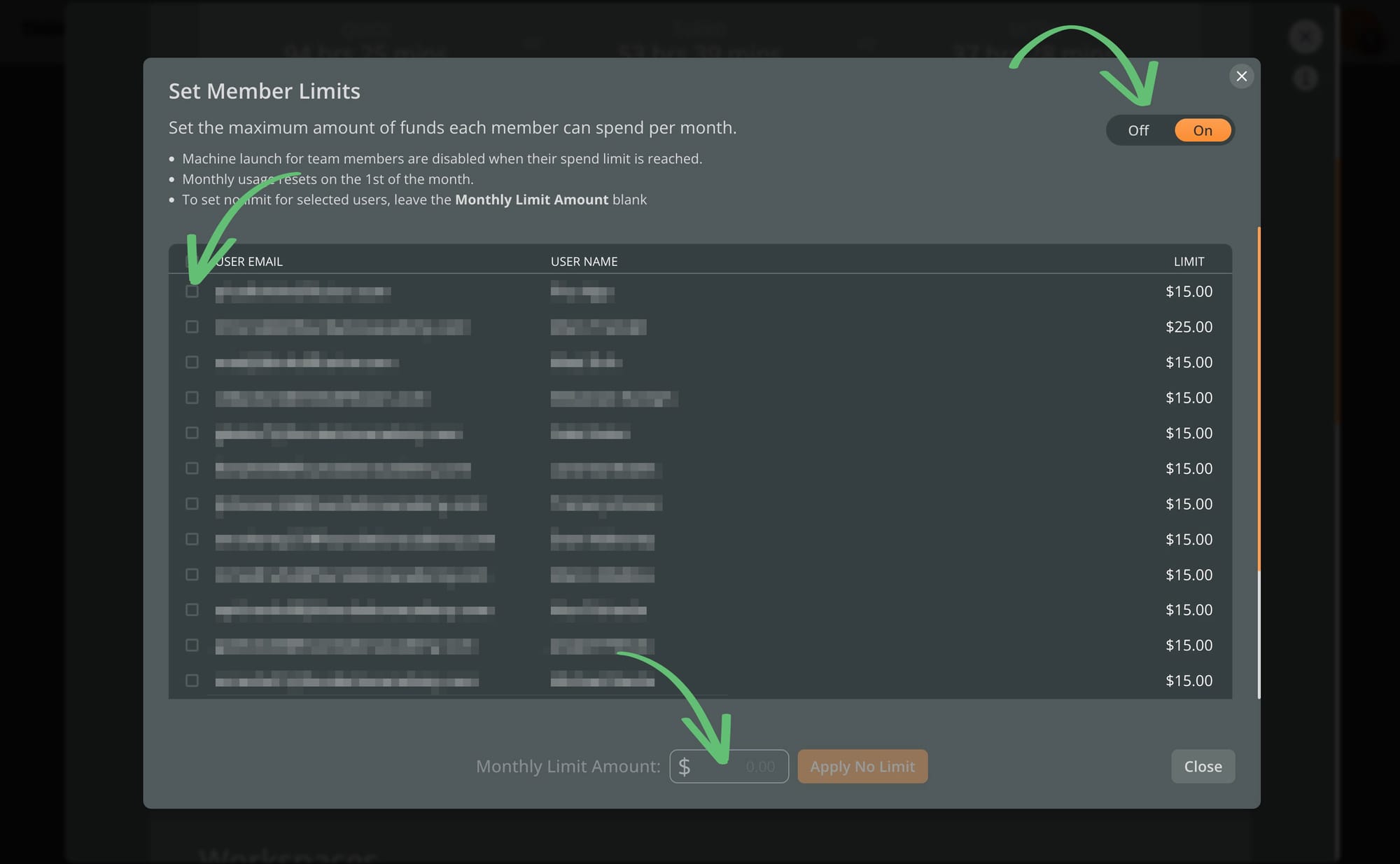 Toggle the setting on "On" and you can set limits individually or set a standard amount for everyone by clicking the checkboxes on the corresponding students.